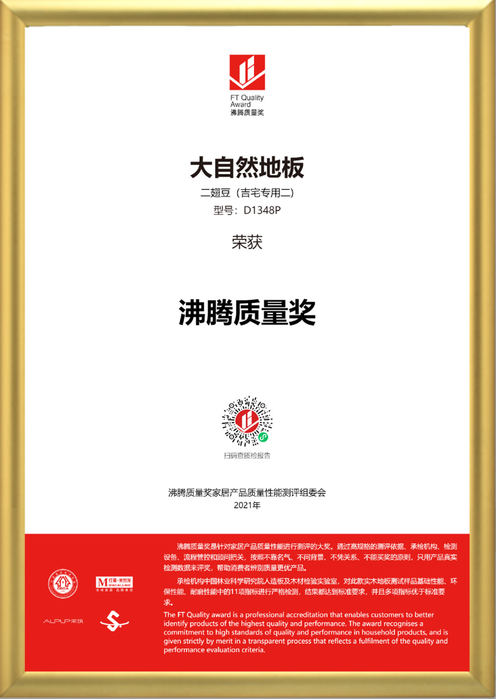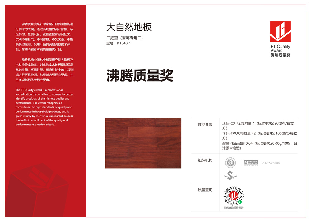 2021年9月28日,在由中國建筑裝飾協(xié)會等單位指導,沸騰質量獎家居產(chǎn)品質量性能測評組委會主辦,紅星美凱龍、采筑電商平臺共同協(xié)辦,中國林業(yè)科學研究院人造板及木材檢驗實驗室承檢的2021沸騰質量獎實木地板質量性能測評中,大自然地板(二翅豆吉宅專用二,型號:D1348p)憑借優(yōu)異的品質,獲得“沸騰質量獎”,展現(xiàn)產(chǎn)品競爭實力。