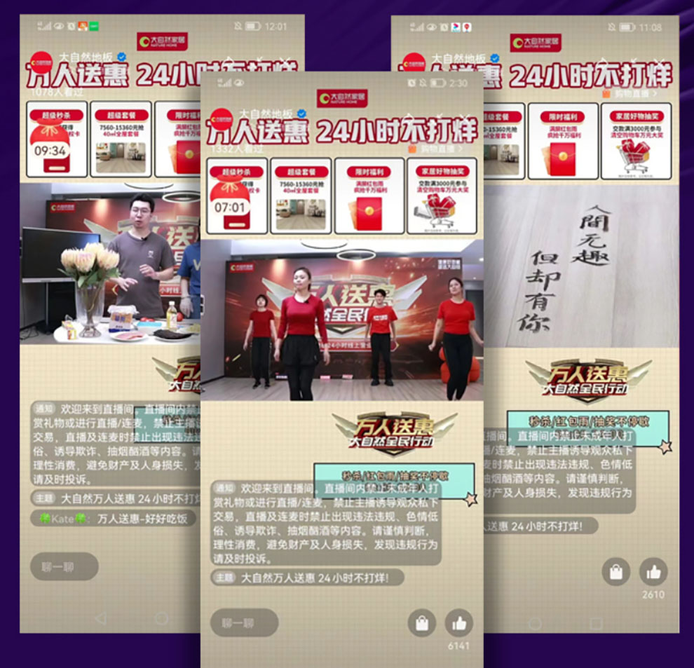直播玩出綜藝范。大自然家居直播間打破了單純講解產(chǎn)品的枯燥方式,通過地板書法展、地板美食節(jié)、地板健身操等綜藝類活動(dòng),提高直播的趣味性,吸引粉絲參與互動(dòng),讓直播間變身為綜藝現(xiàn)場(chǎng),受到粉絲的熱捧。憑借創(chuàng)新的直播玩法,大自然家居在618大促期間多次占據(jù)天貓平臺(tái)直播小時(shí)榜榜首。