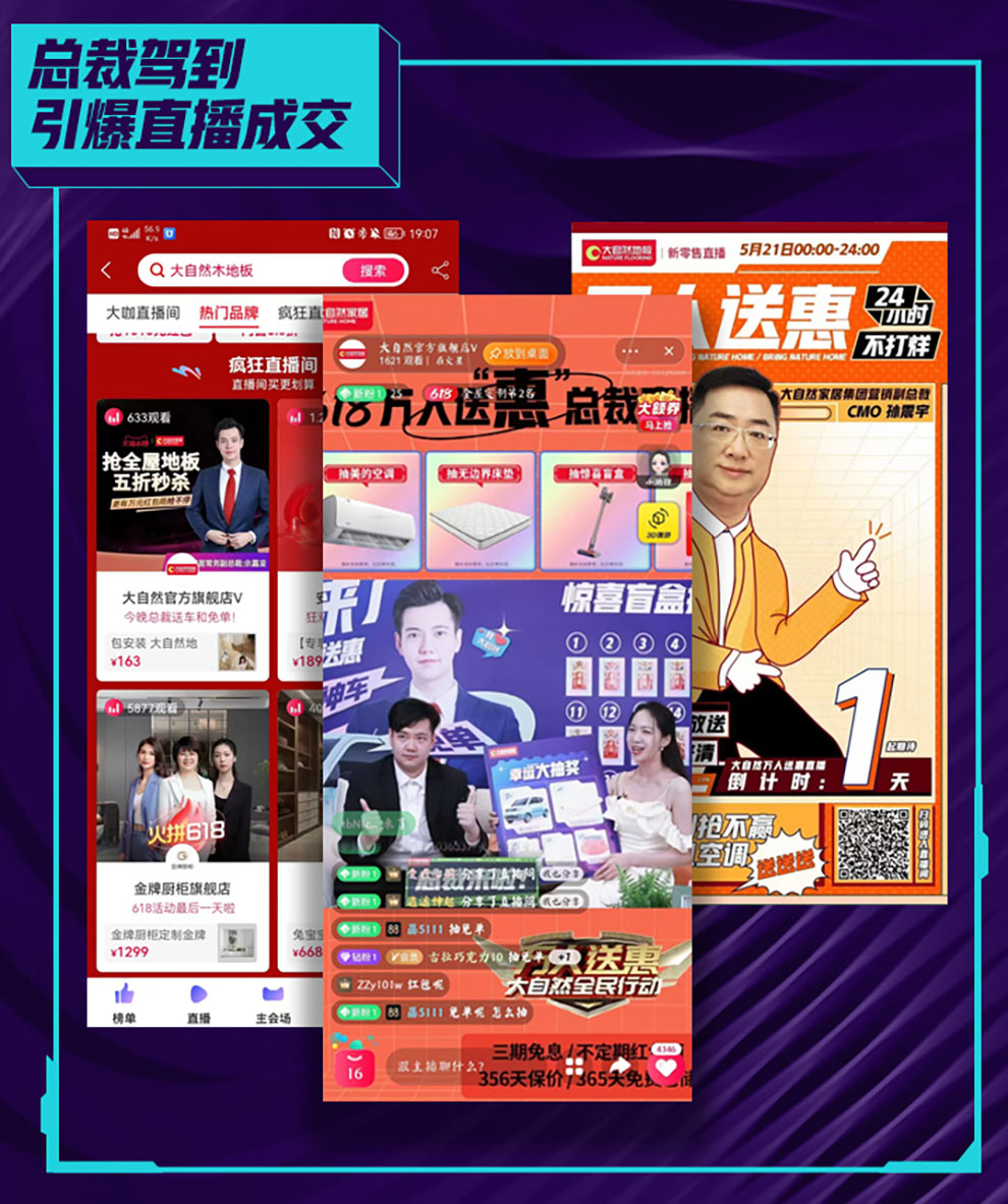 公司總裁直播送福利。大自然家居集團(tuán)常務(wù)副總裁佘嘉浚先生、首席營(yíng)銷官孫震宇先生到直播間,為觀眾送上特別福利:抽盲盒、整點(diǎn)紅包、大屏抽獎(jiǎng)、紅包雨,甚至送出五菱宏光、美的空調(diào)、大自然床墊等大獎(jiǎng),引爆了直播間。