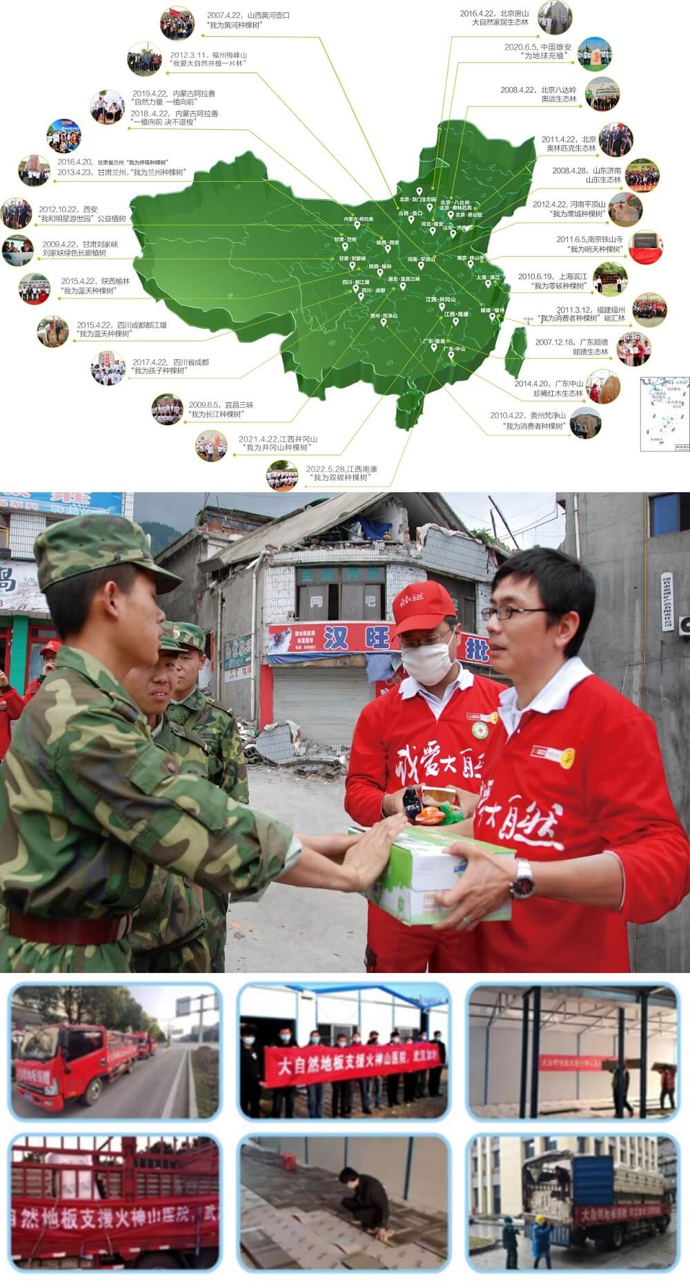 大自然家居深耕公益事業(yè)十幾年,從2006年啟動“中國綠色版圖”工程,累計向中國綠化基金會捐資超過1500萬元,并每年開展植樹活動,截止到2022年,在國內(nèi)外共種植了27片公益生態(tài)林,植樹逾80萬棵,植樹面積超過102萬平方米。2008年,汶川地震,大自然家居率先弛援捐資救災(zāi)。2020年,新冠疫情爆發(fā),大自然家居先后向武漢火神山醫(yī)院、湖北五峰縣中醫(yī)院婦幼保健院捐資木地板超2500m2,共克時艱。