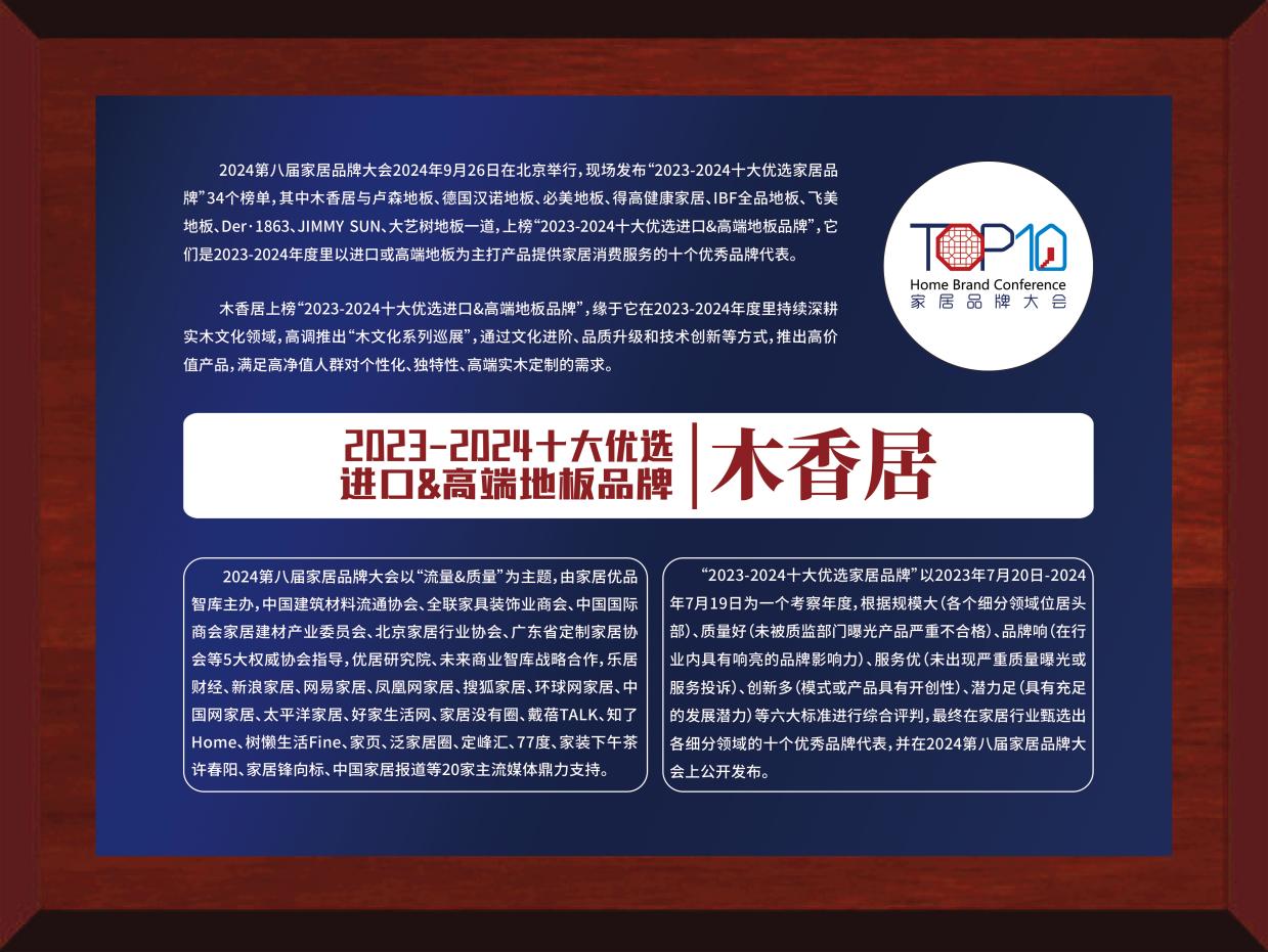 近日,2024年第八屆家居品牌大會(huì)于北京成功舉辦,并同步發(fā)布“2023-2024家居十大優(yōu)選品牌”榜單。其中,大自然家居榮獲“2023-2024十大優(yōu)選地板品牌”、大自然家居旗下高端品牌木香居榮獲“2023-2024十大優(yōu)選進(jìn)口&高端地板品牌”。